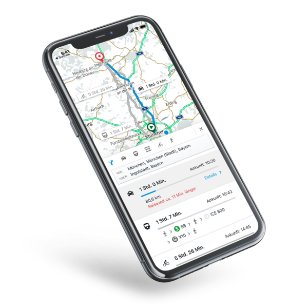 In der Verkehrslagekarte ist ein Routenplaner für alle Verkehrsmittel integriert. Hier fließen auch Echtzeit-Daten des öffentlichen Verkehrs mit ein.