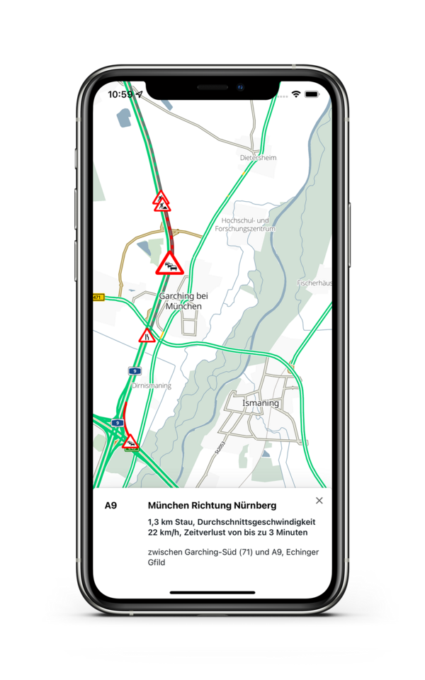 BayernInfo Maps is a free-of-charge mobile application which included a route planner cars and public transport. A good knowledge about road works, blocked roads and other travel restrictions helps you safe time and money.